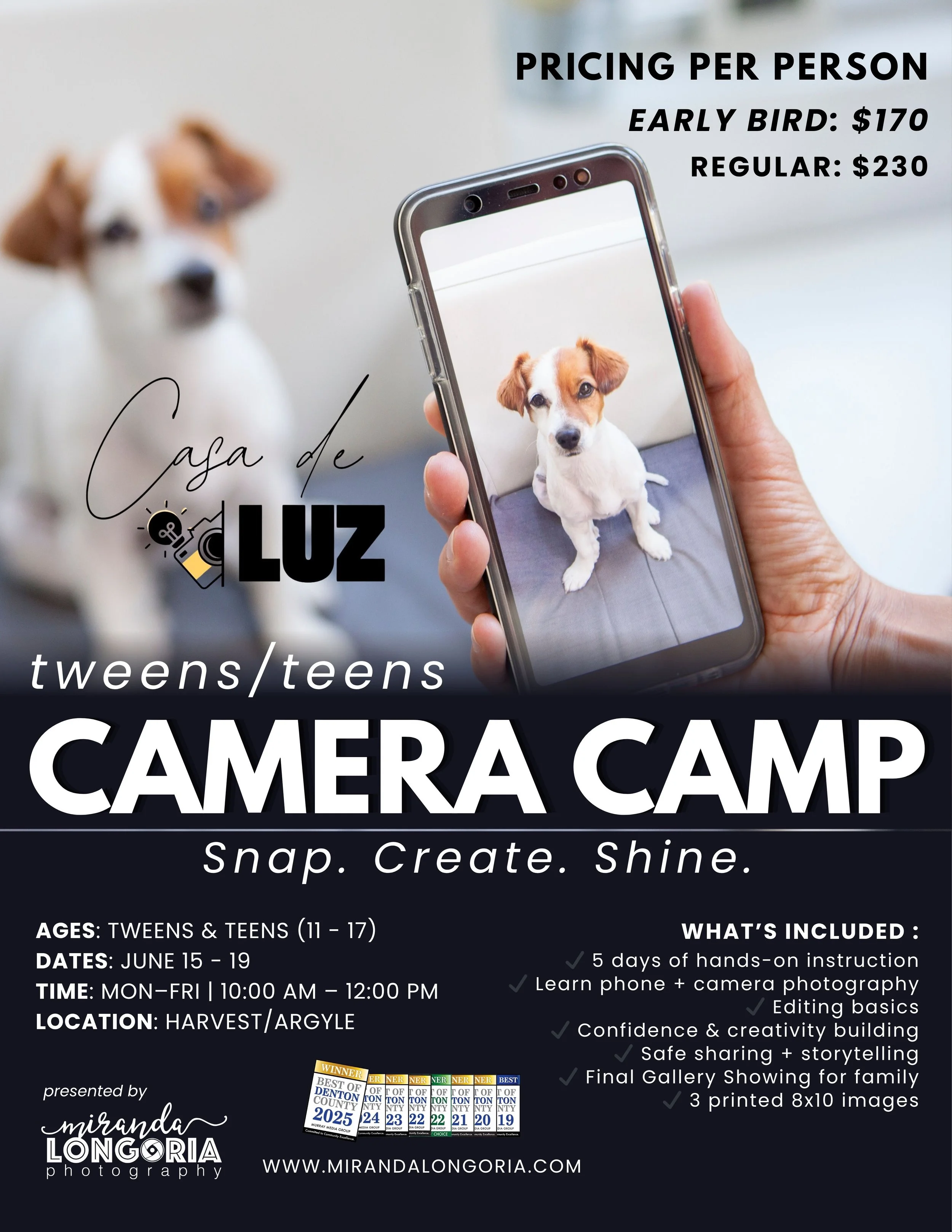 Casa de Luz Camera Camp is a 5-day creative experience designed for tweens and teens who want to explore photography, build confidence, and express themselves in a supportive and inspiring environment.